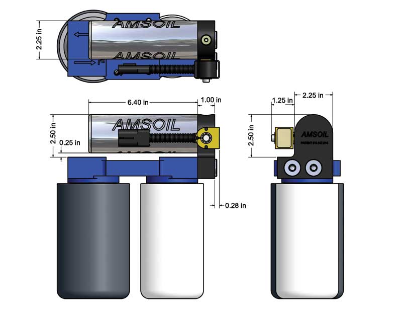 With an extremely rugged hi-grade carbon steel reservoir and anodized aluminum base, the AMS-Oiler® is crafted to withstand severe service and to perform reliably in any personal, commercial or industrial application. Unlike other pre-charger systems, the AMS-Oiler® has no bulky moving parts which need maintenance and does not rely on pressurized gas to function. Unlike air-actuated competitors, the AMS-Oiler® can be mounted at any angle and discharges oil even under the most severe conditions. The AMS-Oiler® is substantially smaller, more convenient to mount and safer than large, bulky, pressurized gas devices. Pressurized gas units AMS-Oiler® Oil Precharger By-Pass/Dual Remote Mounted (AMK-01) & Stand-Alone (AMK-02) range from 18 to 21 inches long with a diameter up to four inches, while the AMS-Oiler® is only about eight inches long and four inches wide. The AMS-Oiler® is a self-contained, streamlined unit that has a mechanical life cycle exceeding one million engine starts, with no maintenance required. The AMS-Oiler® is self-lubricating with an integrated overpressure protection device that protects units from retaining pressures in excess of 65 p.s.i.