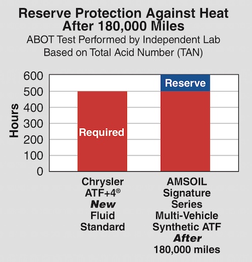 Signature Series Synthetic ATF is formulated with high concentrations of antioxidants, making it naturally heat resistant. It provides outstanding protection against sludge and varnish deposits that clog narrow oil passages and contribute to clutch glazing. After 180,000 miles in severe service, fluid analysis revealed Signature Series Multi-Vehicle Synthetic ATF contained 83 percent of its original oxidation inhibitors, proving its long-lasting resistance to thermal breakdown.