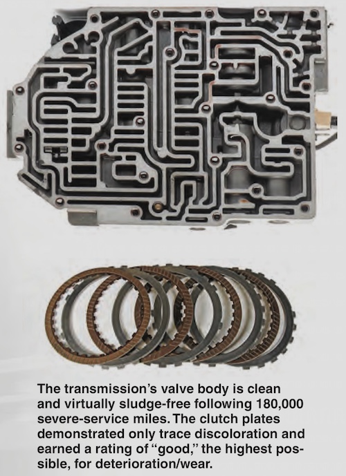 To demonstrate its effectiveness in severe service, Signature Series Multi-Vehicle Synthetic ATF was installed in Las Vegas taxi cabs. The vehicles routinely encountered demanding stop-and-go driving loaded with passengers and cargo, while the desert environment presented extremely hot ambient temperatures, placing enormous strain on the fluid. Following 180,000 miles, a transmission was selected for analysis. The Aluminum Beaker Oxidation Test (ABOT) is an industry standardized test used to determine a transmission fluid's oxidation resistance, which is a good indicator of its service life. Testing by an independent, third-party lab revealed that after 180,000 miles in severe service, Signature Series Multi-Vehicle Synthetic ATF resisted oxidation longer than required for new fluid to meet the Chrysler ATF+4 specification (see graph). Internal components, including the valve body and clutch plates (pictured), were virtually free of damaging sludge, deposits and wear, confirming the lubricant's high level of protection for severe-service applications.